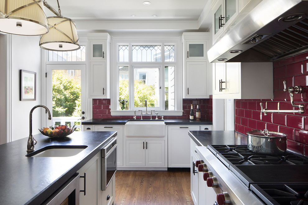 It's a highly functional layout. A breakfast nook, a star feature of farmhouse kitchens, is given a contemporary twist with an angular configuration. Book a free consultation today; U shaped kitchen design with islands.